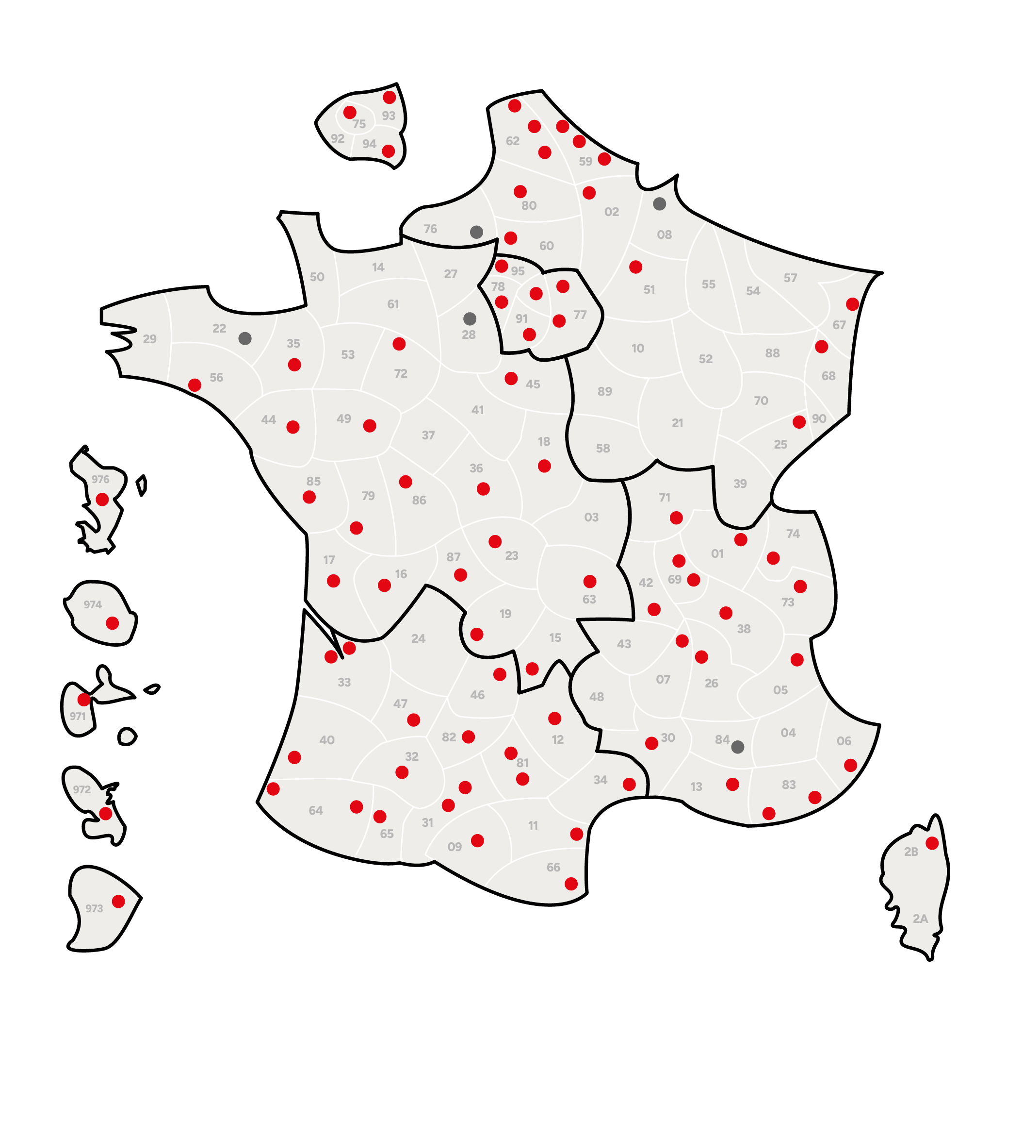 Nos agences sont implantées sur l’ensemble du territoire national et réparties sur 5 régions, y compris dans les DROM.
