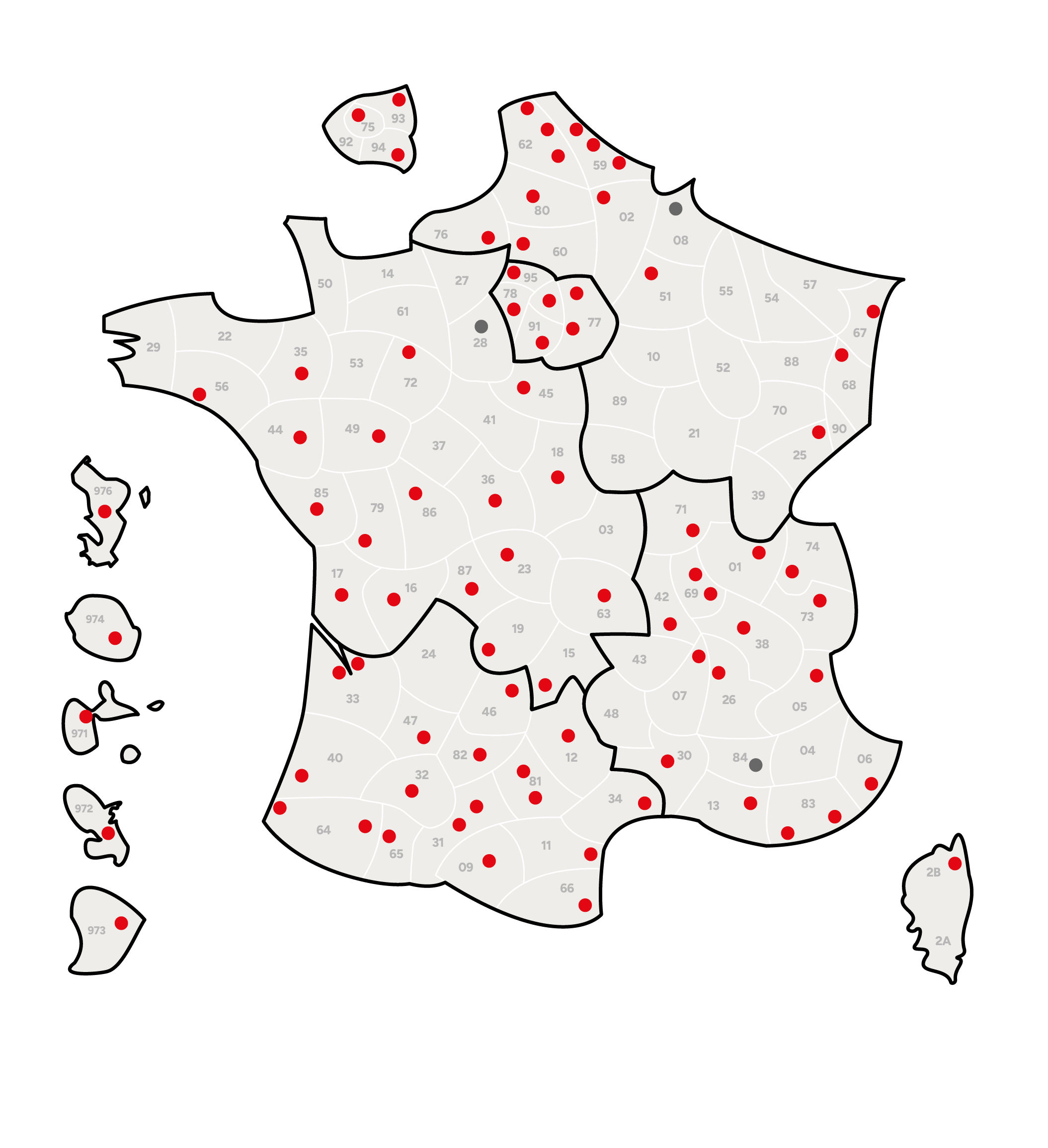 Nos agences sont implantées sur l’ensemble du territoire national et réparties sur 5 régions, y compris dans les DROM.